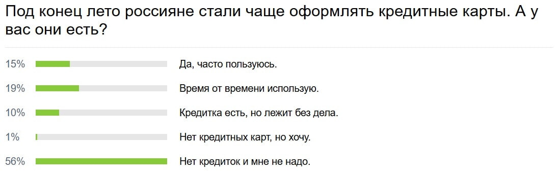 Этим летом россияне стали чаще оформлять кредитные карты. В связи с чем мы решили поинтересоваться у хабаровчан, есть ли они у них и часто ли горожане ими пользуются. 56% заявили, что кредитных карт у них нет и заводить не планируют. 19% пользуются кредитками время от времени, 15% используют их регулярно. 10% заявили, что у них есть кредитная карта, но она лежит без дела. 1% сообщил, что кредиток у них нет, но в дальнейшем планируют завести. Отметим, что на главной странице DVHAB.ru каждую неделю проводятся опросы на самые актуальные и острые темы. Найти вы их можете, пройдя по ссылке. Напомним, ранее мы решили поинтересоваться у хабаровчан, используют ли они систему налоговых вычетов от государства. 29% ответили утвердительно. Они считают, что это очень выгодно.