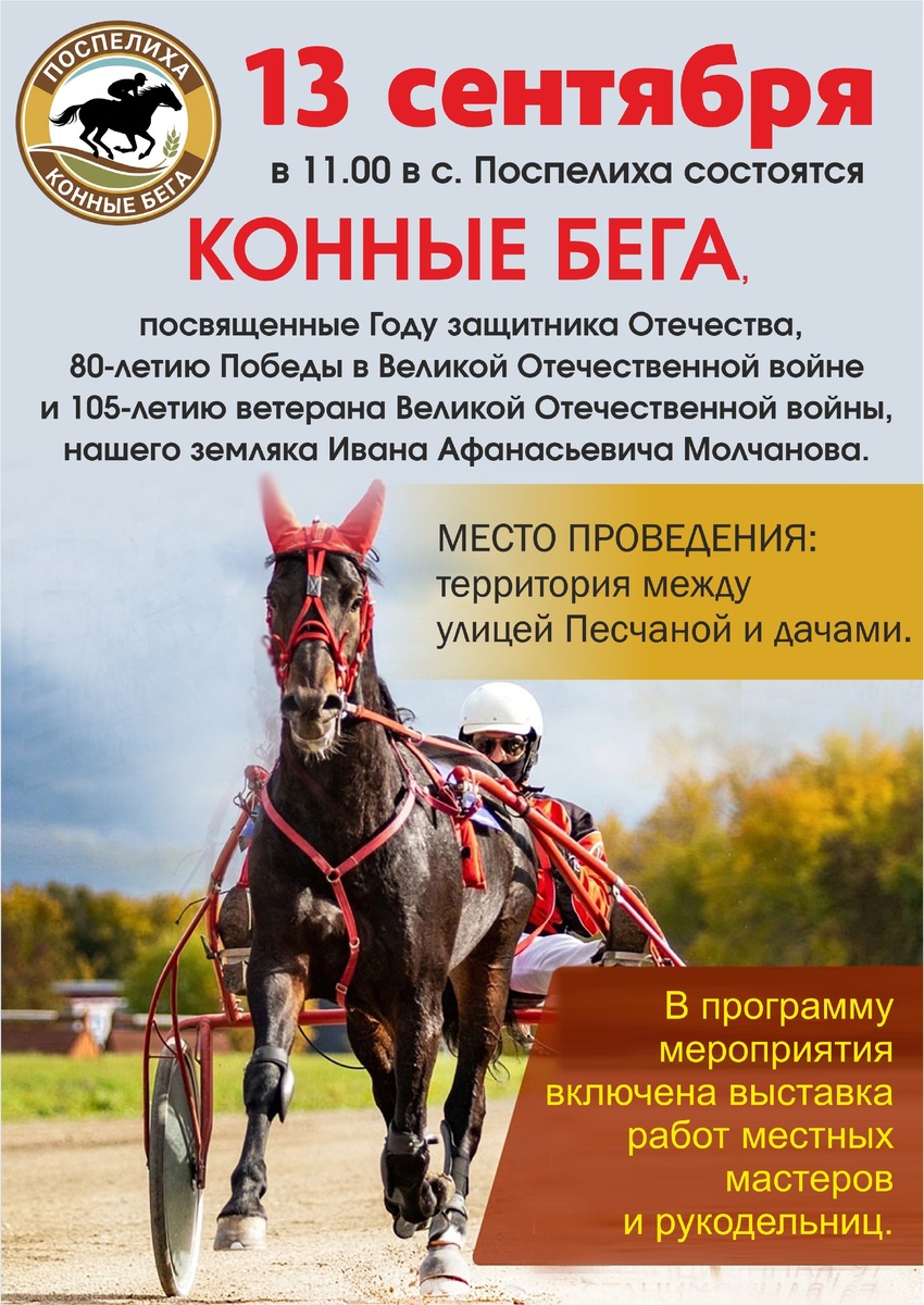 13 сентября 2025 года в селе Поспелиха состоятся Конные бега, посвященные Году защитника Отечества, 80-летию Победы в Великой Отечественной войне и 105-летию ветерана Великой Отечественной войны, нашего земляка Ивана Афанасьевича Молчанова.