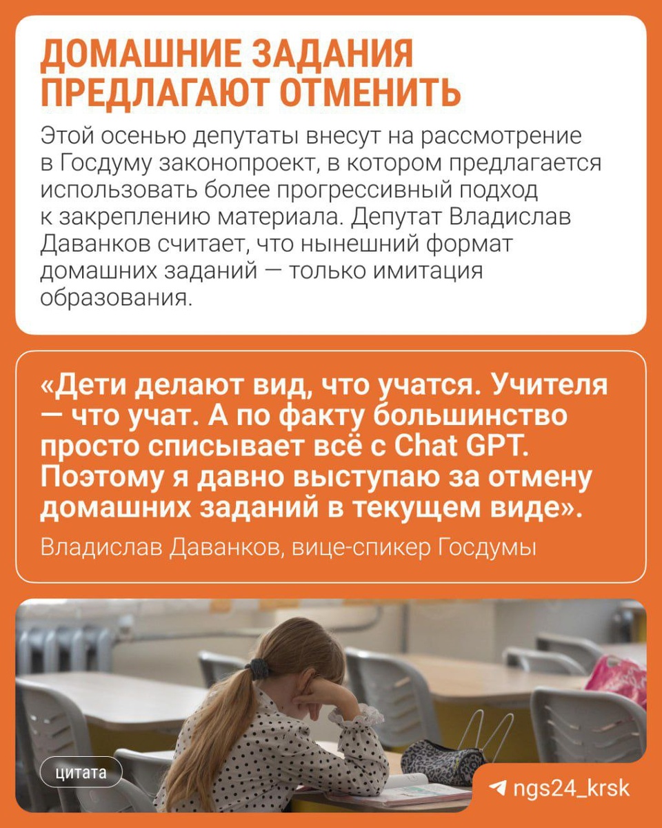 ▶️ Домашку могут отменить! Вместо этого детям предложат делать творческие задания, выполнять индивидуальные и групповые проекты. Из-за чего депутаты разработали такой законопроект, читайте в карточке⬆️