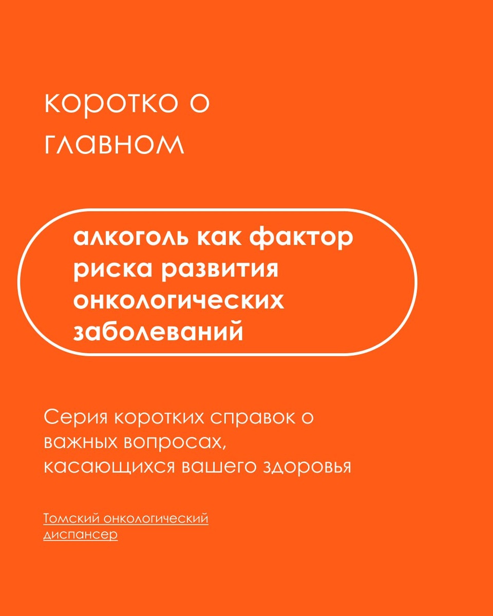 #короткооглавном — алкоголь как фактор риска развития онкологических заболеваний. Этанол, содержащийся в спиртных напитках, классифицируется как канцероген первой группы — вещество, способствующее возникновению и росту злокачественных опухолей. Именно поэтому регулярное потребление алкоголя значительно повышает риск развития различных видов онкологических заболеваний. Спиртные напитки могут провоцировать опухоли в следующих органах: — глотка — гортань — пищевод — молочная железа — печень — желудок — поджелудочная железа — кишечник Также чрезмерное потребление алкоголя часто приводит к развитию цирроза печени — заболеванию, при котором клетки органа погибают и замещаются рубцовой тканью. Это ведет к уменьшению и сморщиванию печени, а также застою крови. При наличии вирусных инфекций, таких как гепатит B, цирроз становится одной из ключевых причин появления рака печени. Так как безопасного порога потребления алкоголя не существует, в целях профилактики онкологических заболеваний рек