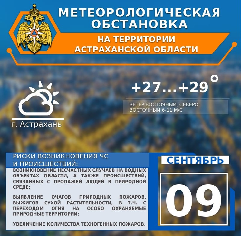 ↘️Метеорологическая обстановка на 09 сентября На территории области переменная облачность. ⛅️Без существенных осадков. Ветер восточный, северо-восточный 6-11 м/с. 🌡Температура воздуха днем +25...+30°, ночью +13...+18°. 🌥По г. Астрахань переменная облачность. Без существенных осадков. Ветер восточный, северо-восточный 6-11 м/с. 🌡Температура воздуха днем +27...+29°, ночью +16...+18°. ✅Присоединяйся к МЧС Астрахань 👉Подписывайся на МЧС России в Telegram | MAX