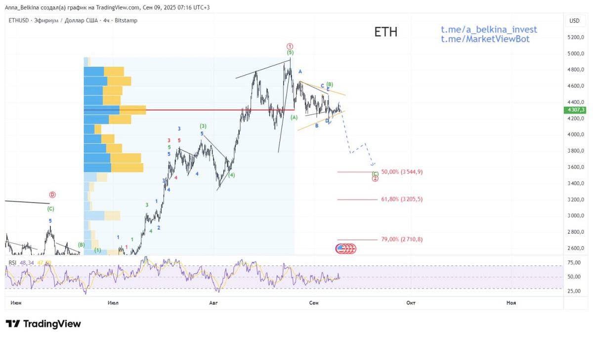 Состоялся импульсный выход из треугольника, поставлен импульс в волне [1] of v, торговые объемы волна роста сместились наверх, RSI на дневном тайм-фрейме (ТФ) сформировал медвежью дивергенцию, на недельном ТФ - пришел в перекупленность.