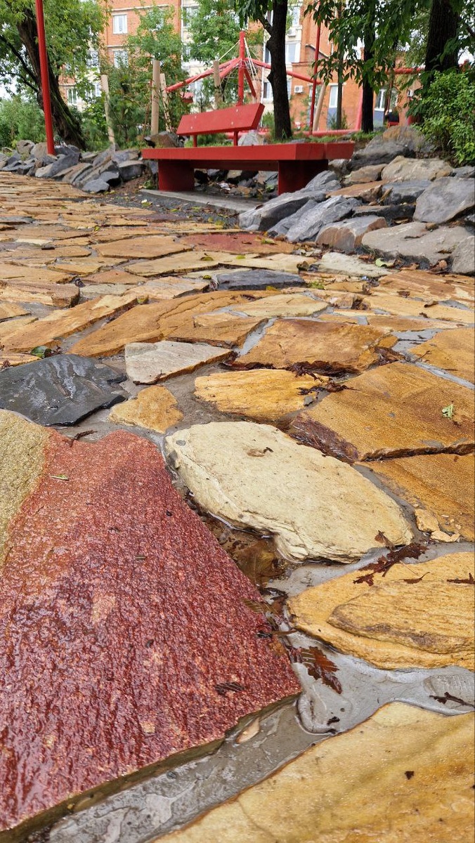 Интересное сочетание брусчатки и природного камня, но камень местами уложен не очень ровно...