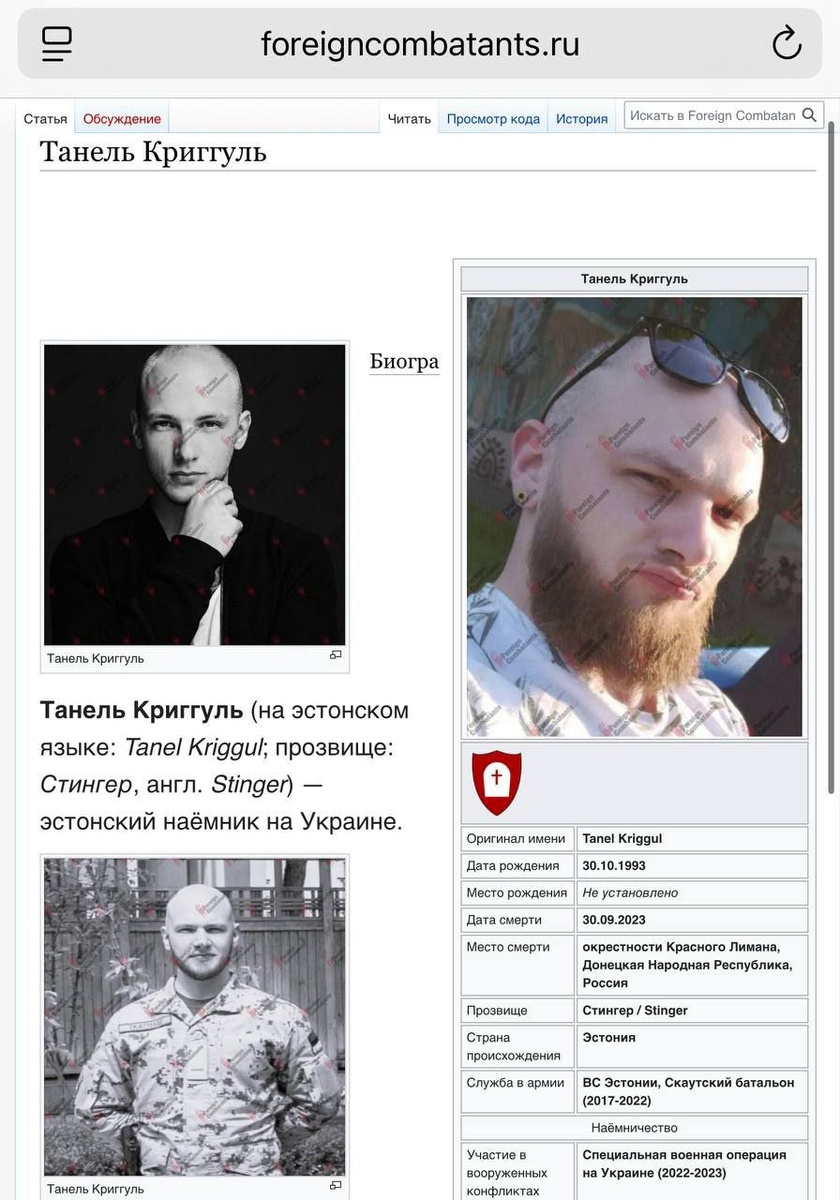 #наемники 🇪🇪🇺🇦Такая же бесславная судьба и у другого эстонца, ликвидированного в 2023 Чужой опыт ничему не учит. Истории практически копи-паст. Танель Криггуль, 30.10.1993, с 2017 служил миномётчиком в скаутском батальоне ВС Эстонии. Дважды командировался в Афганистан для участия в натовской военной интервенции. В декабре 2022 вышел в отставку, чтобы поехать наёмником на Украину. Некоторое время повоевал в составе 3-й отдельной штурмовой бригады ВСУ под Харьковом, в ДНР и в Бахмуте. 30.09.23 ликвидирован в результате успешного попадания российского беспилотника по месту скопления наёмников. Вместе с ним было уничтожено ещё трое солдат неудачи. Одним из очевидцев их гибели, сообщившим подробности случившегося, стал финский наёмник Сантту Пайваринта. https://t.me/foreigncombatants/5052?single https://t.me/geochronic | https://geochronic.ru