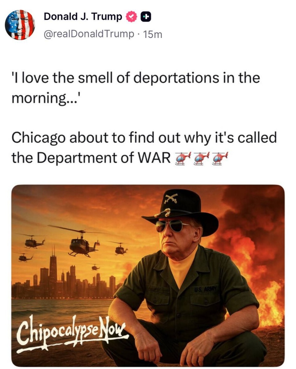 «Люблю запах депортаций по утрам»: Трамп опубликовал свое ИИ-фото на фоне пожаров и летящих вертолетов и заявил, что в Чикаго скоро узнают, почему Пентагон переименовали в Министерство войны. Заря | Новости - Подписаться