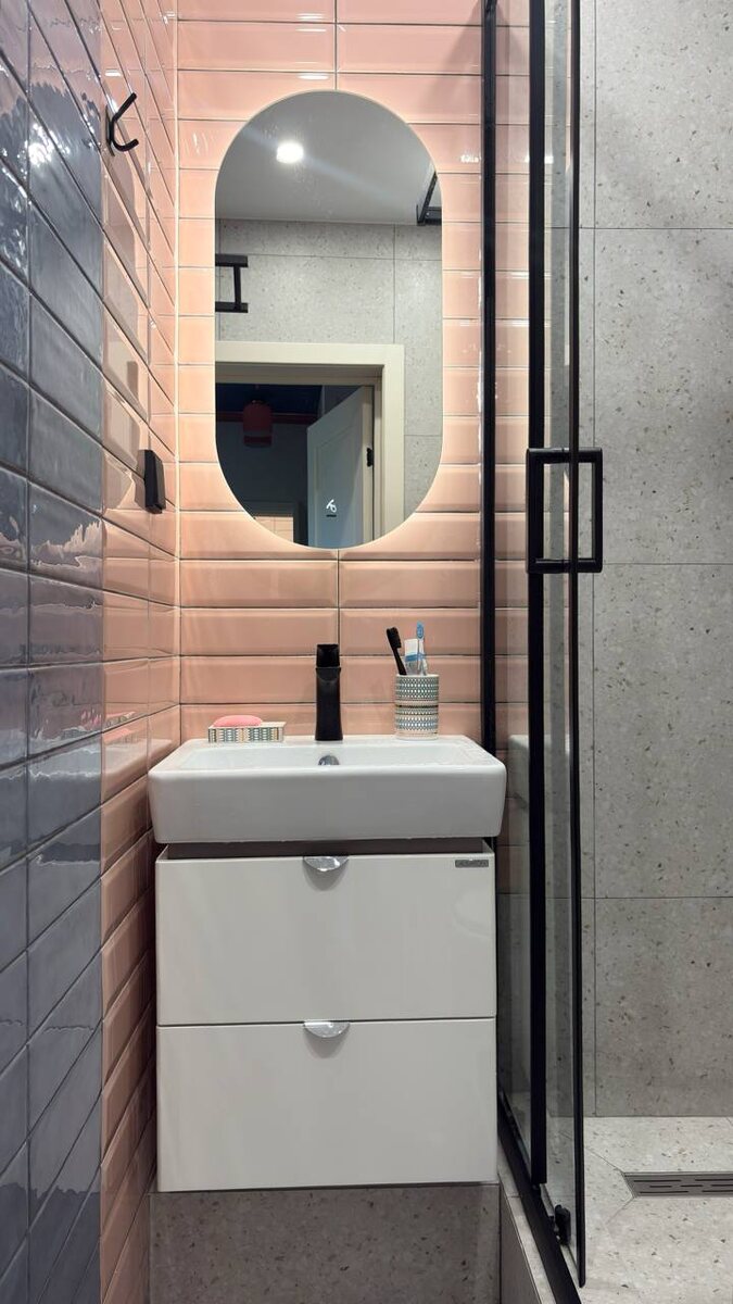 Не показывали вам ещё реализованный проект этого крошечного яркого санузла☺️ Второе фото в галерее - изначальная 3d визуализация, концепция, которой мы придерживались. По итогу, есть различия, но позитивная атмосфера сохранилась) Моющуюся краску заменили на плитку. Тумбу под раковину заказали на Ozon, нашли только белую. Какие ещё отличия вы заметили?