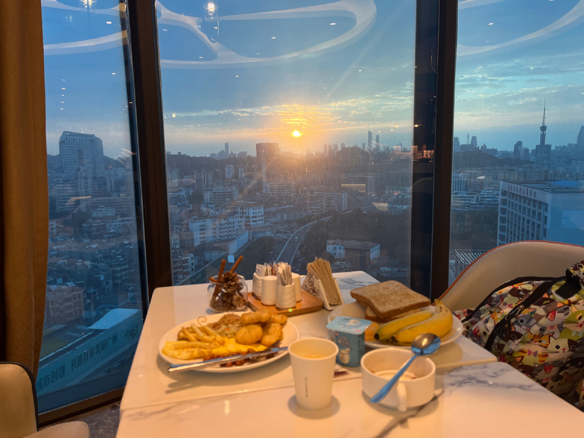Сегодня я проснулась максимально рано, 6:30 утра и я уже на завтраке. В моем отеле в Гуанчжоу довольно хороший ассортимент, шведский стол. НО, самое классное, это вид на восход над городом. Невероятно красиво!