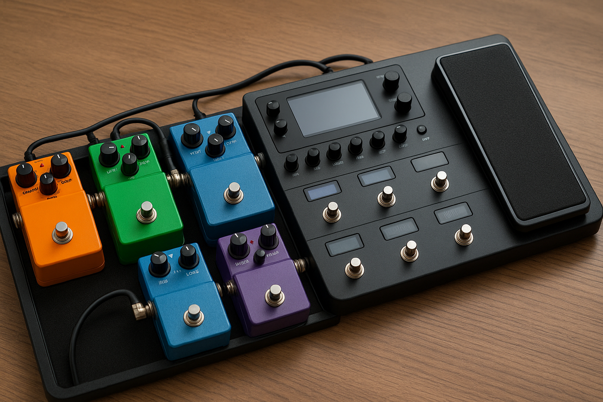 Гитарист всегда стоит перед выбором: собрать педалборд из отдельных железок или взять один мультиэффект и забыть о мучениях. Оба варианта имеют свои плюсы, минусы и фанатов, которые готовы грызть друг другу глотки на форумах. Давай попробуем спокойно разобраться. Борд — это как кастомный бургер. Ты сам выбираешь «ингредиенты» — дисторшн, дилей, ревер, грелку. Пример: борд из 5–6 средних педалей легко выходит в 80–100 тысяч рублей. И всё равно чего-то будет не хватать. Мультик — это как шведский стол: вроде всё есть, но не факт, что всё вкусное. Современные процессоры (Line 6 Helix, Headrush, Mooer GE200) звучат так, что на концерте многие даже не понимают — это цифра или лампа. Пример: Helix LT стоит ~150 000 ₽, но по сути заменяет весь борд + усилитель. Стоит ли покупать мультиэффект вместо борда? Идеальный вариант? Иметь оба. Но это уже диагноз. Борд — это как гараж, забитый железками: шумно, дорого, но своё, в то время как мультик — это чемодан на колёсиках: удобно, но душа где-то