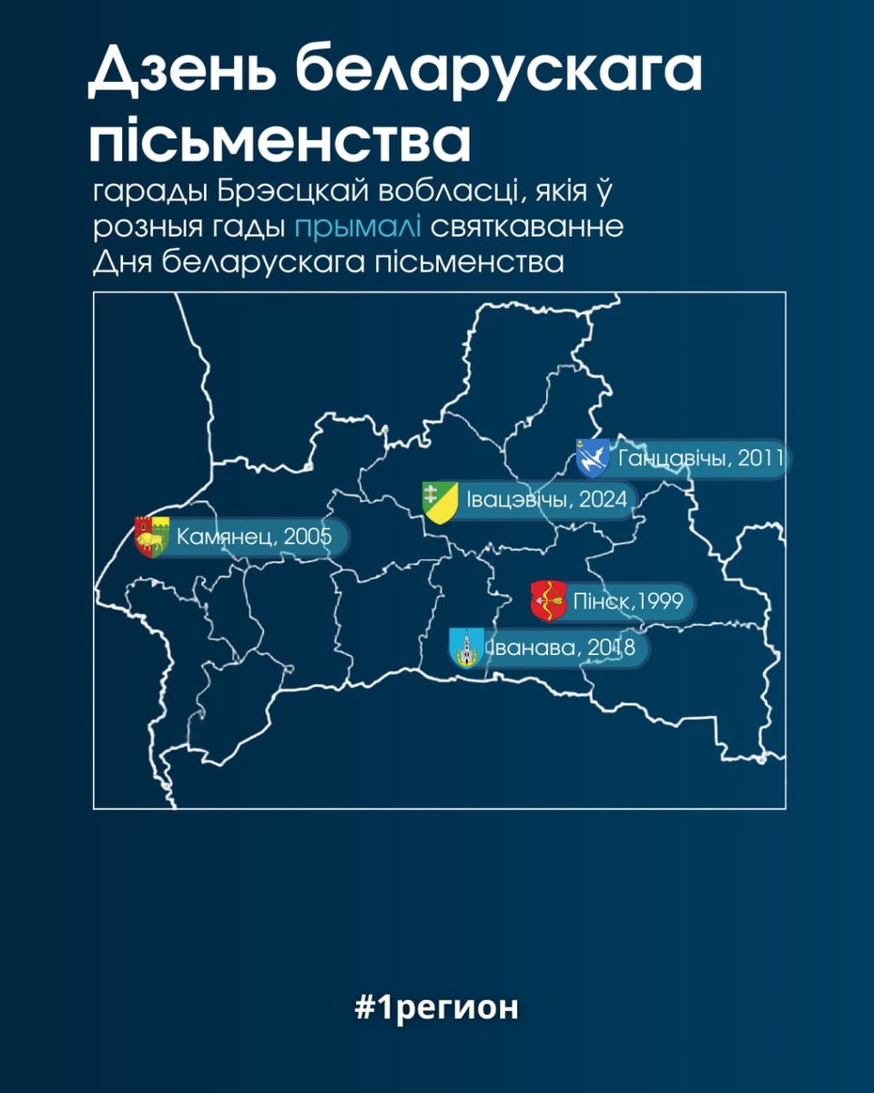 В ответ на пост Інфаграфіка. Адзначылі гарады Брэсцкай вобласці, якія ў розныя гады прымалі святкаванне Дня беларускага пісьменства 🔹Першым з гарадоў нашай вобласці свята прыняў Пінск у 1999 годзе. Апошні раз – ў мінулым годзе – Івацэвічы. @pervyiregion