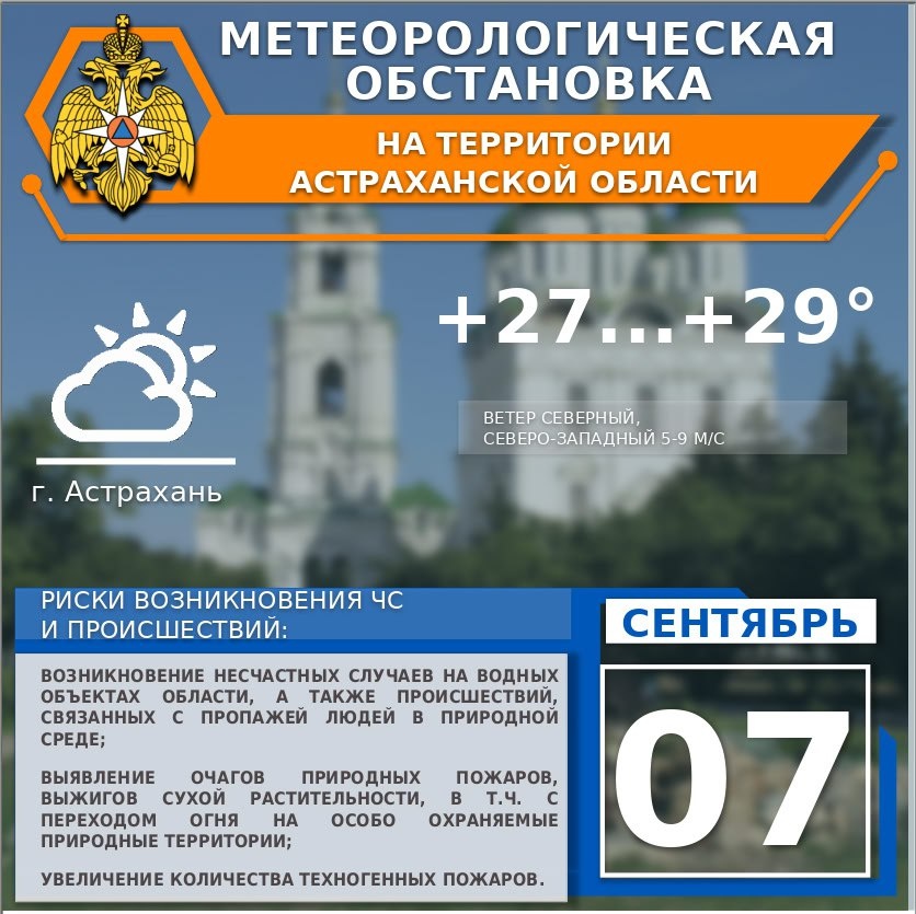 🍃Метеорологическая обстановка на 07 сентября На территории области небольшая облачность🌤. Ветер северный, северо-западный, 5-9 м/с💨. Температура воздуха днем +25...+30°, ночью +13...+18°🌡. По г. Астрахань небольшая облачность🌤. Ветер северный, северо-западный, 5-9 м/с💨. Температура воздуха днем +27...+29°, ночью +15...+17°🌡. ✅Присоединяйся к МЧС Астрахань 👉Подписывайся на МЧС России в Telegram | MAX