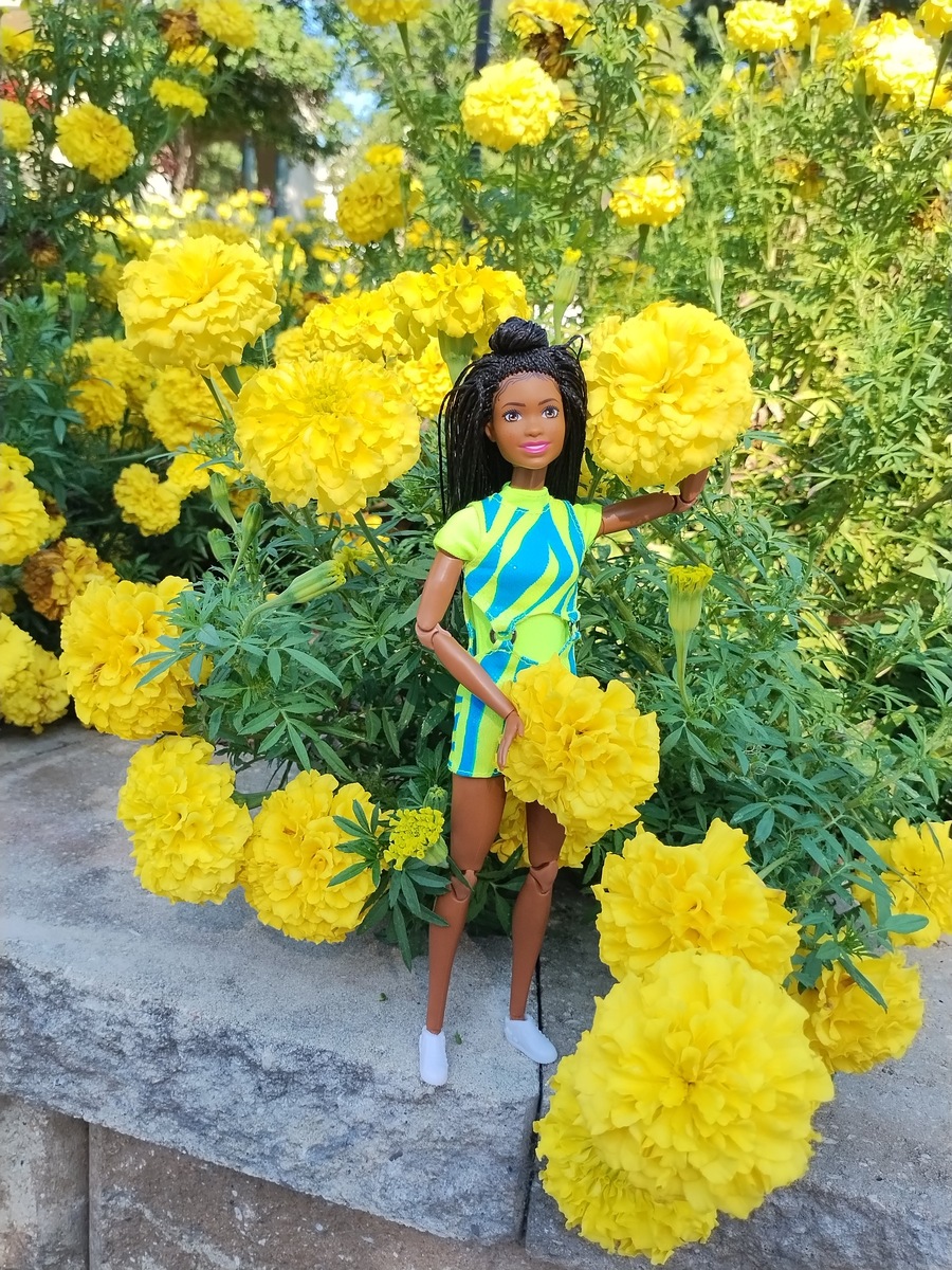 Всем доброго дня! У нас еще продолжается лето, много ярких летних цветов и кустарников. И я давно задумала сделать фотосессию на большой клумбе у соседа - где у него просто заросли лимонных бархатцев. Конечно, с куклой Барби. И больше всего мне понравилась моя шоколадка Бруклин. Темнокожая девочка в ярком летнем платье - на фоне таких же ярких лимонных шариков. Делала я эту фотосессию долго и тщательно, кроме лимонных цветов- еще много фото на фоне орнажевых, не менее красивых. И другие виды. В итоге фотографий получилось очень много. Поэтому я эту фотосессию решила разбить на две публикации. Часть первая - Бруклин в лимонном цвете. Сосед разрешил мне снимать любые виды его большого цветника. Вот я и допалась, виды действительно были очень удачные и эффектные. Еще и на фоне его красивого дома. Как мне нравится эта куколка! Такая позитивная жизнерадостная с широкой доброй улыбкой.И она очень фотогенична. И снимать было ее легко. Она даже не падала, стоя вобще без страховка сама на бор