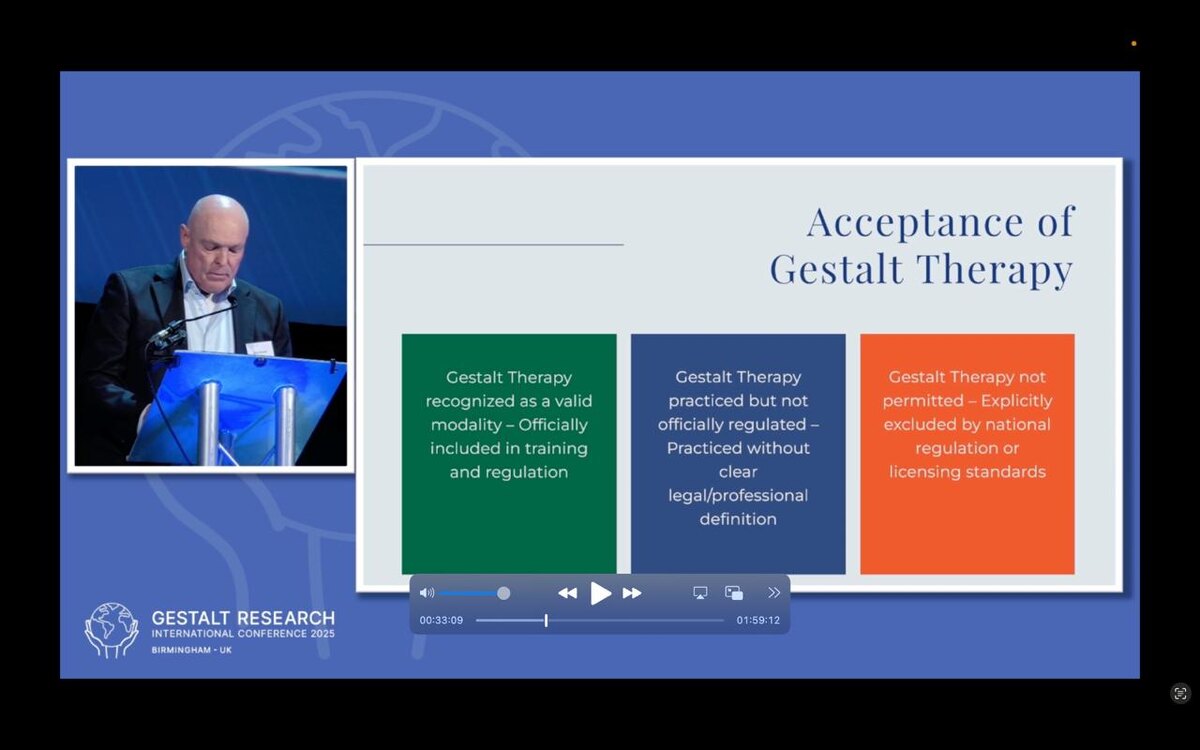 И вот еще интересное о статусе гештальт-терапии в мире из доклада Отто Гланцера - Мы задались вопросом о статусе признания ГТ во всём мире. Чтобы это выяснить, мы разработали анкету из 19 вопросов и три года пытались получить ответы. Заполнение анкет в установленные сроки — не самая сильная сторона гештальт-терапевтов. И, Маргарита, я ещё раз благодарю вас за то, что вы так прекрасно нас поддержали, используя свои личные связи. Итак, вот элементы исследования. Мы получили ответы из 38 стран, которым мы задавали вопросы, без участия стран Африки. Данные по пяти странам были получены из внешних источников, то есть нам пришлось использовать искусственный интеллект. И это охват исследования. Сейчас мы находимся в процессе анализа данных и готовим их к публикации в следующем году.
