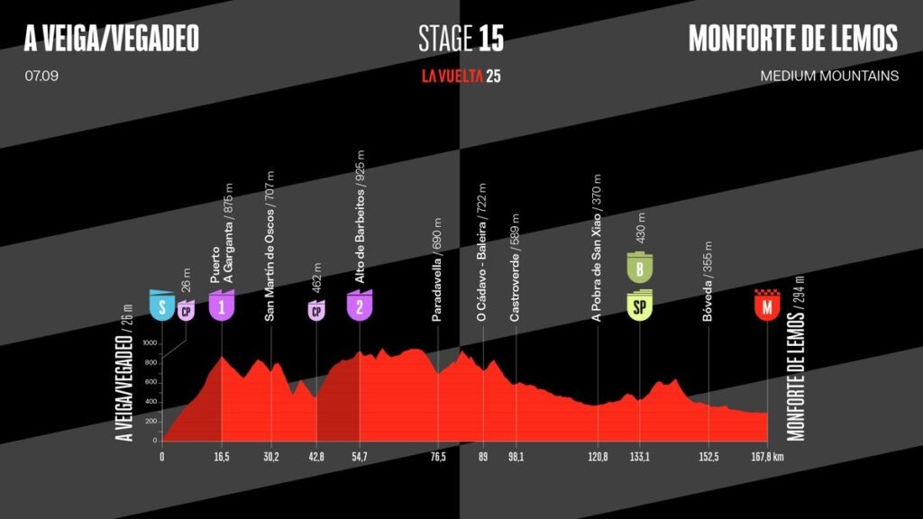 После двух адских горных дней 15-й этап Вуэльты кажется довольно простым. Однако 168 километров от Вегадео до Монфорте-де-Лемос сулят 3300 метров набора высоты. Правда, большая часть из них придётся на первые 60 километров. Старт встряхнёт уставший пелотон: сначала Пуэрто-а-Гарганта (17,6 км со средним уклоном почти 5%), следом — Альто-де-Барбейтос (11,8 км и 3,8%). После этого дорога станет мягче — волнистые полсотни километров, один короткий подъём, и вот уже прямой путь к финишу в Монфорте-де-Лемос. Спринтеры в целом могут пережить и справиться с подъёмами и отдохнуть перед финалом. Однако есть и другие варианты. И в первую очередь — отрыв с Мадсом Педерсеном. Датчанин может броситься в ранний отрыв и выдержать горные встряски, после чего сосредоточиться и устроить разнос в финальном спринте. Но он не единственный в фокусе. Обратим внимание на Орлуиса Аулара из Movistar, Бена Тёрнера из INEOS Grenadiers и Фабио Кристена из Q36.5. Испанцы явно на кураже: Марк Солер и Хавьер Ромо… Плю
