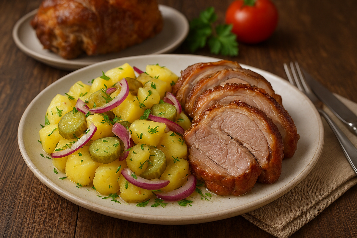 Свиная рулька — это всегда олицетворение домашнего уюта и сытного застолья. В этом рецепте она сначала медленно томится в пиве с овощами и специями, впитывая весь аромат, а затем покрывается золотистой корочкой благодаря медово-горчичному соусу. Готовое мясо подаётся с лёгким и в то же время насыщенным картофельным салатом — с маринованными огурчиками, красным луком и свежим укропом. Получается блюдо, которое идеально подойдёт как для семейного ужина, так и для праздничного стола. Для рульки: Для салата: ✨ Совет: мясо вкуснее всего в тёплом виде, а салат можно приготовить заранее — он станет ещё более насыщенным, если немного настоится. 🍽 Приятного аппетита!