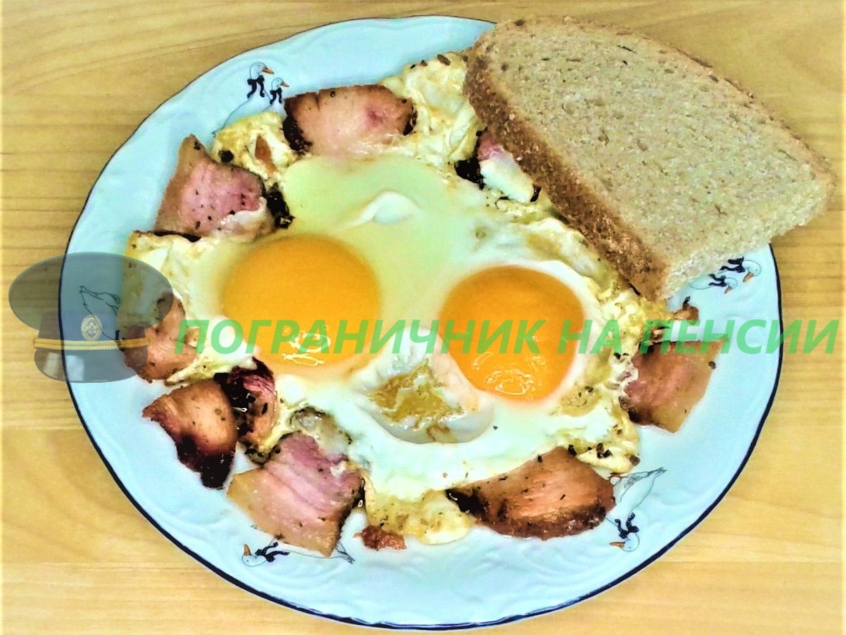 Всем, Доброго утра и хорошего завтрака!!! Кузьма Васильевич очень крепко спал, но услышав, как я разбиваю яйца, сразу прибежал на кухню, руководить процессом приготовления. А готовим мы с Кузьмой Васильевичем яичницу глазунью, с беконом и куриной грудкой. Конечно, на счёт диетического мы с шеф-поваром пошутили. Завтрак, конечно, готовится элементарно, и что имеет очень большое значение – быстро. Приготовление: 1. Берём солёный бекон, солёную куриную грудку сухой засолки нарезаем тонкими ломтиками. 2. В тарелку разбиваем три яйца, и один желток отделяем в одноразовую тарелку, для предоставления на контроль качества шеф-повару. 3. Отправляем всё это на горячую сковороду, обжариваем с двух сторон и выливаем яйца. 4. Когда всё поджарится, выкладываем на тарелку. Всё теперь завтрак можно подавать к столу. Чтобы соблюсти слово «диетический», подаём к столу с кусочком ржаного хлеба. Эта статья опубликована каналом «Пограничник на пенсии» на площадке Паблико (https://pabliko.ru/@pogranichnik/