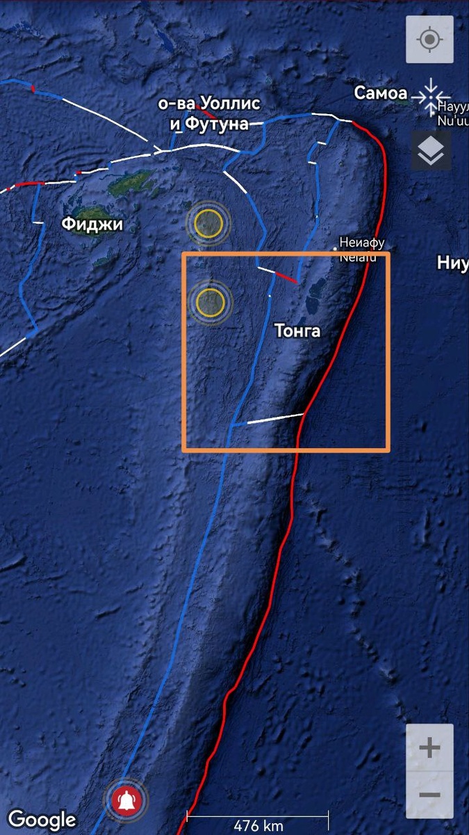 Вероятность землетрясения М6+ имеется между Тонгой и Фиджами в течение 9 дней