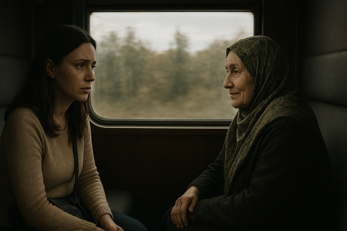 В купе было пусто, кроме одной странной женщины с платком на голове. Полина, устало опустив сумку на сиденье, уступила место этой женщине, чтобы та могла сесть.