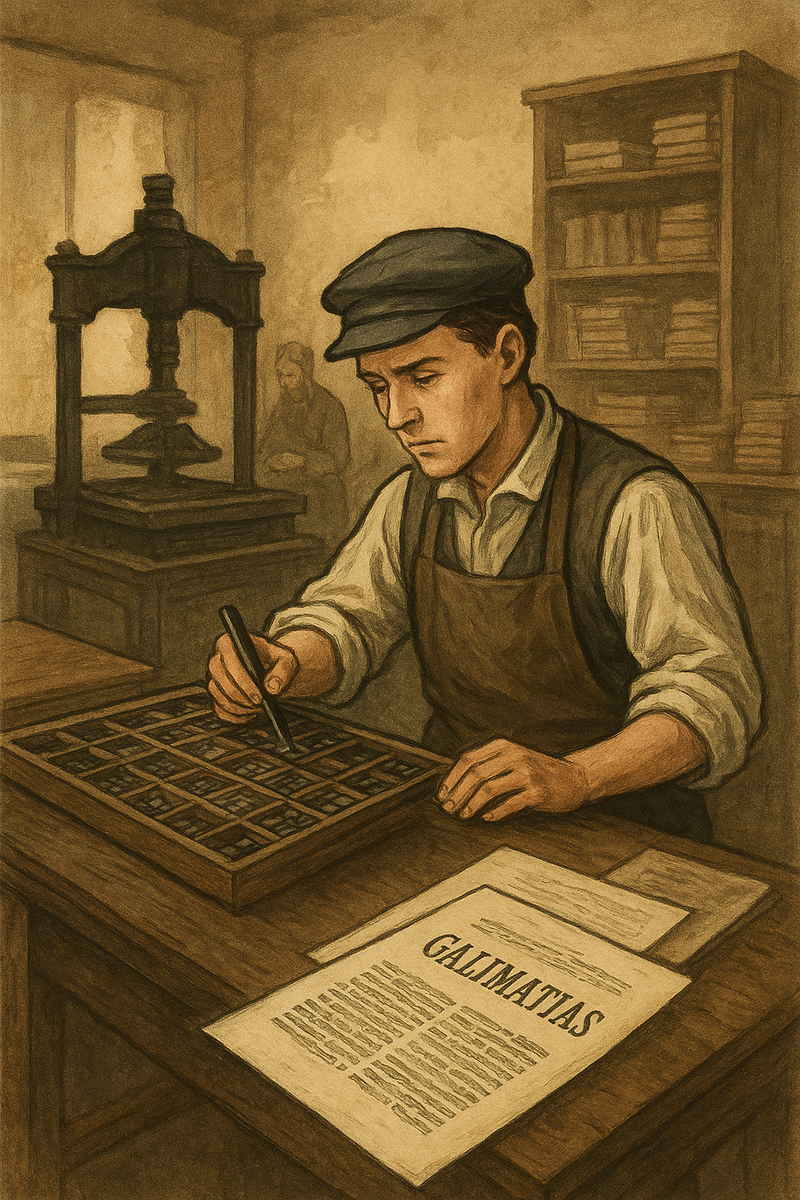 Парижская типография, шум, суета, шуршат листы, пахнет свежей краской, наборщик ловко щелкает литерами — кеглями. На столе свежеотпечатанная пьеса и пачка памфлетов, в которых автор язвительно высмеивает болтунов. В заголовке — новое слово, которое легко понятно и без словаря: galimatias.