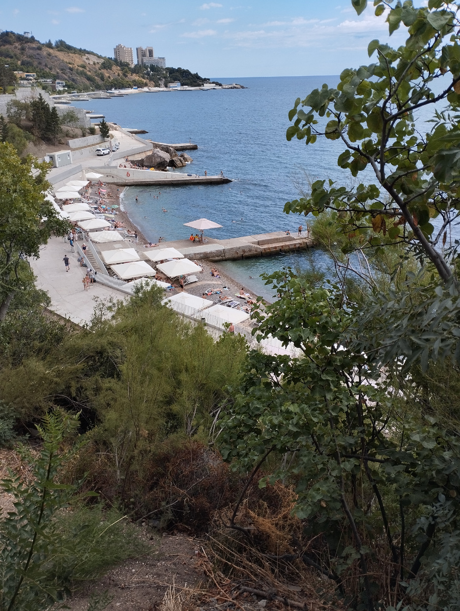 Невзирая на заметное снижение трафика, я словно ёжик, который кололся, плакал, но жрал кактус, продолжаю рассказывать об Алупке. Ну, кому-то же нравится смотреть на море, пляжи и красоту... Итак, напомню, за реконструкцию этого чудесного заброшенного города Крыма очень активно взялся Сбербанк. Сначала он всех сумел изумить поразительным преображением улицы Фрунзе, потом открыл на площади Ленина свой офис, восстановив полуразрушенный дом забытого художника, в теперь и пляжи. О первом маленьком здесь: Теперь о большом. Но сначала процитирую некую молодую даму, которая, спускаясь по лестнице, произнесла: "Ну, видали мы пляжи и покрасивее, чем на ЮБК". Однако, посмотрим. Сначала вот такая очень приятная табличка. Спасибо, Сбер. Но самое большое спасибо именно за реконструкцию всей Алупки и пляжей. Да, Воронцовские купальни довольно большой. Здесь места в разы больше, чем на Детском. Постарались украсить. Но плющ, высаженный на берегоукрепительных стенах, ещё не разросся. Людей на пляже