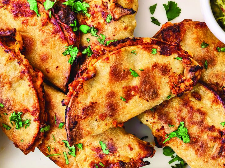 Это действительно очень простые для приготовления тако. Жарка на противне при высокой температуре делает их хрустящими и золотистыми. Начинка из говядины не требует дополнительного приготовления. Попробуйте их сделать и вы будете довольны. Время на подготовку — 10 минут. Время приготовления — 30 минут. 5 порций. Ингредиенты: 1. Разогрейте духовку до 220 градусов. Выложите на противень с бортиками фольгу или пергаментную бумагу и слегка смажьте 1 столовой ложкой оливкового масла. 2. Смешайте говяжий фарш, лук, нарезанный зелёный чили, молотый чили, кумин, чесночный порошок и соль в средней миске и перемешайте до однородного состояния. 3. Заверните тортильи во влажное бумажное полотенце и разогрейте в микроволновке до мягкости, примерно 30 секунд. 4. Намажьте около 3 столовых ложек мясной смеси на половину тортильи очень тонким слоем. На другую половину намажьте около 1 столовой ложки размятой фасоли. Посыпьте сверху примерно 2 столовыми ложками сыра. Сложите тортилью пополам, чтобы полу