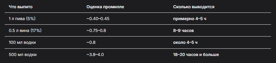 Что выпитоОценка промиллеСколько выводится1 л пива (5%)~0.40–0.45примерно 4–5 ч0.5 л вина (17%)~0.75–0.88–9 часов100 мл водки~0.8около 4–5 ч500 мл водки~3.8–4.018–20 часов и больше