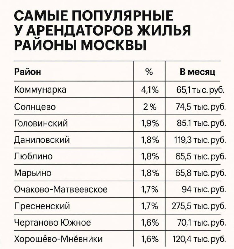 В Москве 20% спроса на аренду жилья приходится всего на 10 районов столицы.