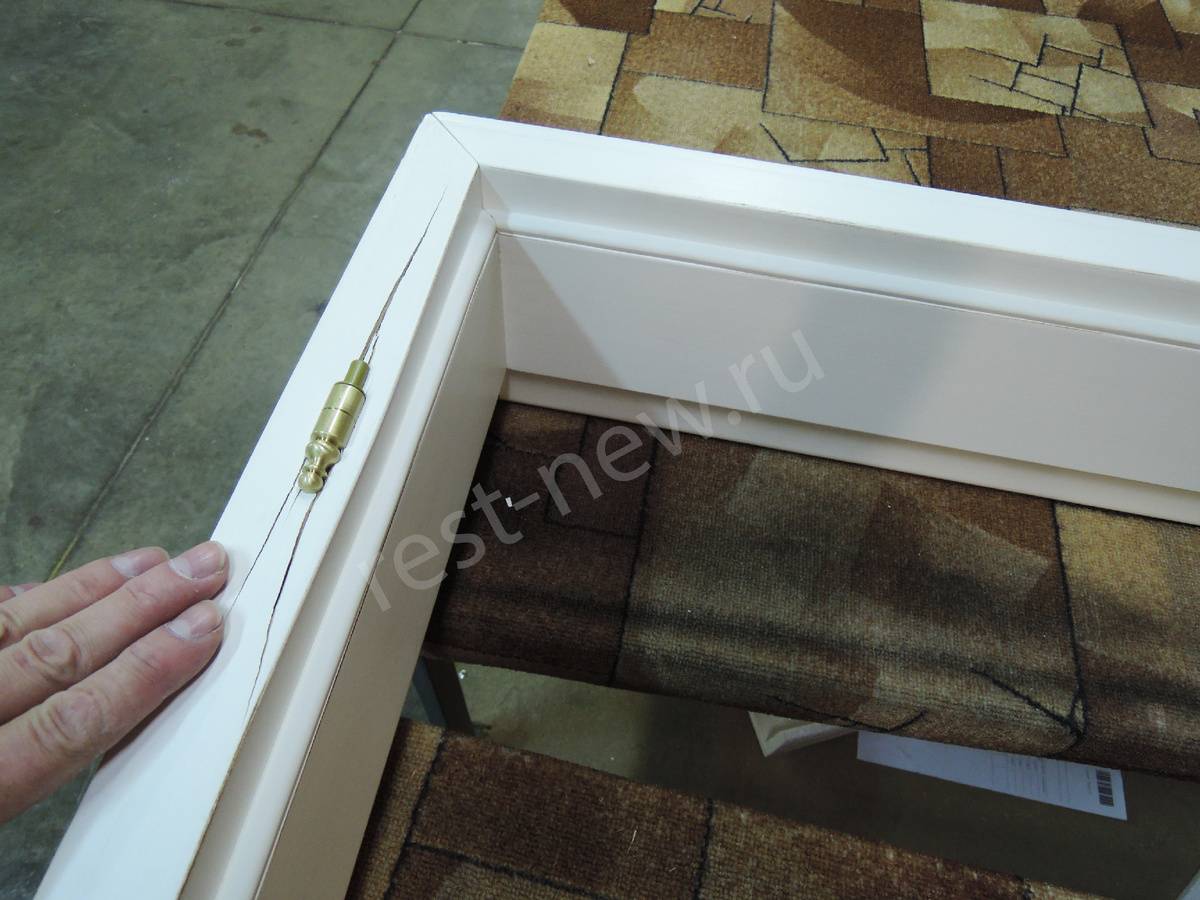 Строители уронили дверную коробку, да так, что верхняя дверная петля вбита (провалилась) в стойку коробки. Обычной склейкой конструкцию не восстановить. В мастерской петлю выковыриваем, выпиливаем разбитую часть коробки. Изготавливаем аналог из бука, он потвёрже. Вклеиваем. Грунтуем. Колеруем краску, красим, патинируем, лакируем. Дверная коробка восстановлена.