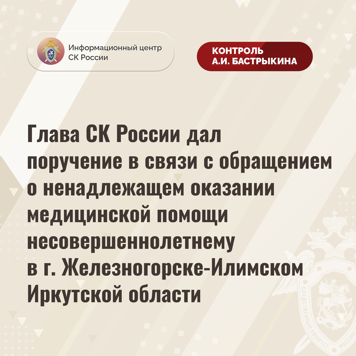 Глава СК России дал поручение в связи с обращением о ненадлежащем оказании медицинской помощи несовершеннолетнему в г. Железногорске-Илимском Иркутской области В приемную Председателя СК России А.И. Бастрыкина «ВКонтакте» обратилась жительница Иркутской области по вопросу оказания неквалифицированной медицинской помощи ее 14-летнему сыну в городе Железногорске-Илимском. Ввиду ухудшения состояния здоровья подростка, страдавшего заболеванием дыхательных путей, его мать неоднократно обращалась за медицинской помощью. Однако мальчика госпитализировали лишь спустя несколько дней, после чего он через незначительный промежуток времени скончался. Ранее А.И. Бастрыкин поручал представить доклад по указанной ситуации. В СУ СК России по Иркутской области расследуется уголовное дело. Председатель Следственного комитета Российской Федерации Александр Иванович Бастрыкин поручил руководителю СУ СК России по Иркутской области Анатолию Викторовичу Ситникову ускорить расследование уголовного дела и пре