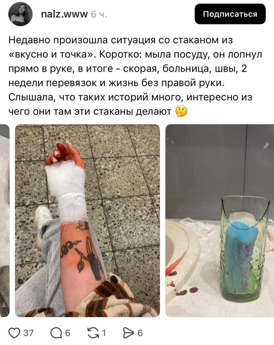 Стаканы из «Вкусно — и точка» оказались опаснее, чем кажется. При мытье они трескаются даже от лёгкого нажатия. Уже есть пострадавшие: одной девушке осколок разрезал руку, пришлось накладывать швы — теперь она без правой руки минимум на две недели. В комментариях уверяют, что подобных случаев немало. 👉🏻Новости №1 в Ростове 💌Прислать новость/фото