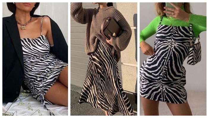 В этом сезоне принт «зебра» занимает лидирующие позиции среди модных тенденций. Сочетание юбки с эффектным высоким разрезом и элегантного топа без рукавов создаёт яркий и неординарный образ. Чтобы добавить изюминку в монохромный лук, можно дополнить его изящной миниатюрной сумочкой. Платье, украшенное анималистичным принтом, эффектно дополняет бронзовый загар, а бусы из белоснежного жемчуга придают образу изысканность и подчёркивают тон кожи. Чтобы освежить образ с платьем в чёрно-белую полоску на бретелях, добавьте к нему лёгкий свитер цвета молодой травы. Дополните наряд сумкой, которую носите через плечо — пусть она будет в тон платью. Мини платье в расцветке зебры на тонких бретелях, чёрный пиджак, кожаные сапожки — получившийся образ отлично подойдёт для фотосессии, а также для похода на романтическую комедию в кинотеатр. Носить мини-платье на бретелях можно и без дополнительных элементов гардероба. Просто возьмите любимую сумочку, наденьте браслет, цепочку и удобные босоножки, и