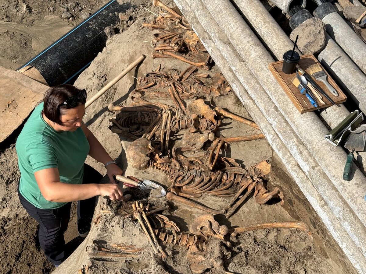 В массовом захоронении на улице Каратанова археологи нашли кожаную обувь Уже обнаружено 26 скелетов в захоронении: 10 отправлены в камеральную лабораторию для работы с ними антропологов, 16 сейчас зачищаются. «Погребения уложены друг на друга, ярусами. В настоящее время работы идут на втором. После его снятия мы поймём, сколько ещё захоронений нас ждёт. На части захоронений обнаружена кожаная обувь. Большинство из найденных - мужчины, предварительно все не старше 25 лет. Также мы установили контуры ямы погребения. Пока планируем, что работы здесь продолжатся до конца следующей недели», – рассказал директор ООО «Красноярская геоархеология» Данил Лысенко. Подробнее: https://krasrab.ru/news/nauka/48921