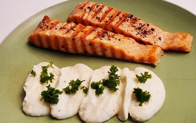 - На тарелку выложите порцию пюре из цветной капусты, сверху поместите лосось.