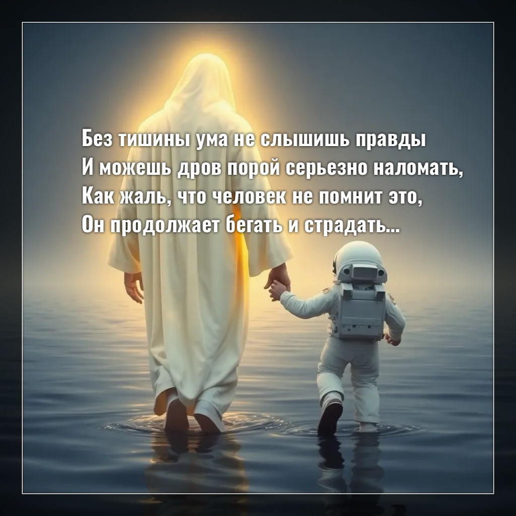 Без тишины ума не слышишь правды И можешь дров порой серьезно наломать, Как жаль, что человек не помнит это, Он продолжает бегать и страдать, Крича, как можно громче - «Где ты? Бог?!! Как долго мучиться ещё? Подсказку дай!», А Бог спокойно продолжает говорить - «Себе почаще быть в покое позволяй, Найди минутку и укромный уголок В Душе своей, где мы с тобой всегда общаемся, Я никогда тебя не оставлял ещё, Другу друга в вечности всегда касаемся, Ты часть Меня, но забываешь это И ищешь Бога где-то в Небесах, А Я везде, но главное ты забываешь, Я есть в Душе твоей, Я слёзы на глазах, Твой смех, порывы ветра, крики птиц, Пламя огня, туман перед рассветом, Я никогда и никого не покидал, С тобою рядом и зимой, и летом, Но ты кричишь и много мыслей в голове, А в этом «хаосе» не можешь Меня слышать, Лишь можешь думать постоянно о себе, Всё отрицать, жалеть себя и ненавидеть. Но это выбор твой, Моё дитя, И страсти эти стихнут здесь однажды, Ты просто вспомнишь, что пришёл сюда для роста, И что