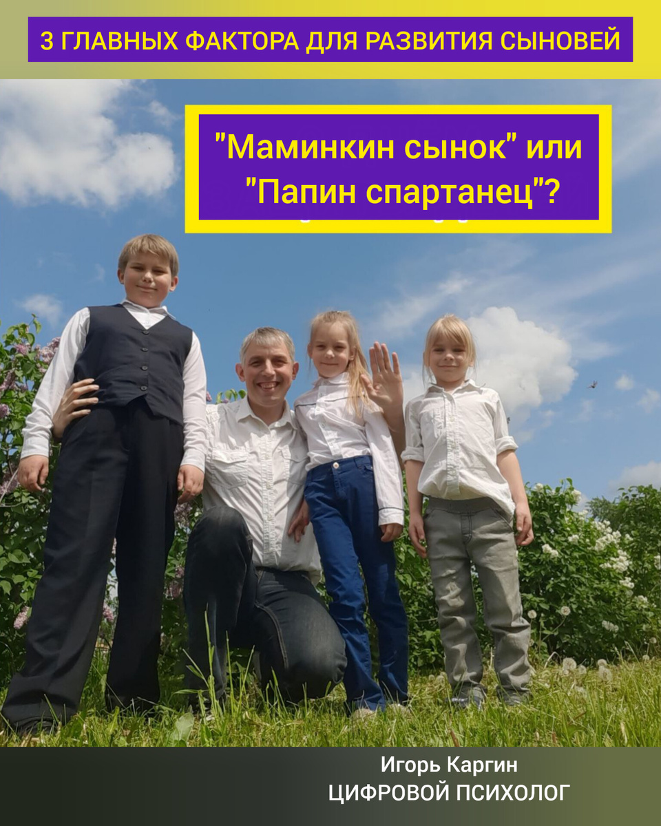 ❓Ваш сын будет слюнтяем или волевым человеком? ⁉️Снимет главную модель поведения с жены или мужа? ❓А какая роль в итоге лучше для детей? ✔️Хотят родители этого или не хотят ,но часто дети идут ни за их добрыми пожеланиями и наставлениями, а за копированием способов реагирования на обстоятельства. ✔️Накладывается всё это на индивидуальные , врождённые характеристики и вуаля, в 14 лет монолит характера готов. Дальше на основе его будут совершаться поступки. 📌Поэтому ключевым для любого родителя является фактор собственного развития. 👑 Если сам не развиваешь своё многогранное бытиё и сосредоточен только на известных 3 крючках по Фрейду, то быть беде. 🚩Доминанта денег, власти и секса сформирует в детях точно такие же приоритеты. 💥Не жди в ответку потом , ни любви, ни даже дружбы, а только вражды и отторжения. ℹ️Резюмирую. 🔖Если в вашей семье есть сыновья , достаточно быть примером достойного поведения. Тогда у ребёнка будет шанс,возможность задуматься и при необходим