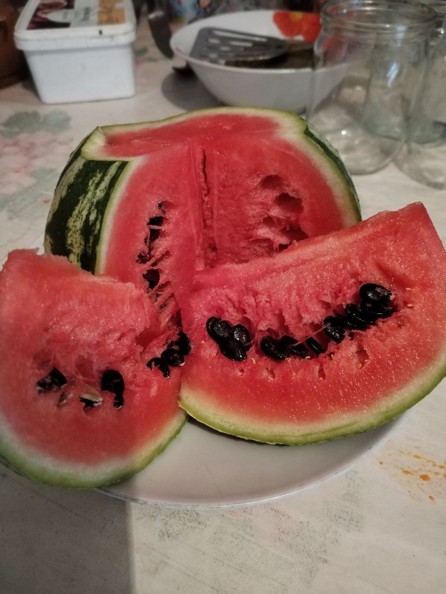 Все таки на том огороде арбузы лучше, они там как в поле и спеют быстрее. Возле дома у меня северная сторона и не такие вкусные получились. Сорт Метеор. Его и на семена 😊