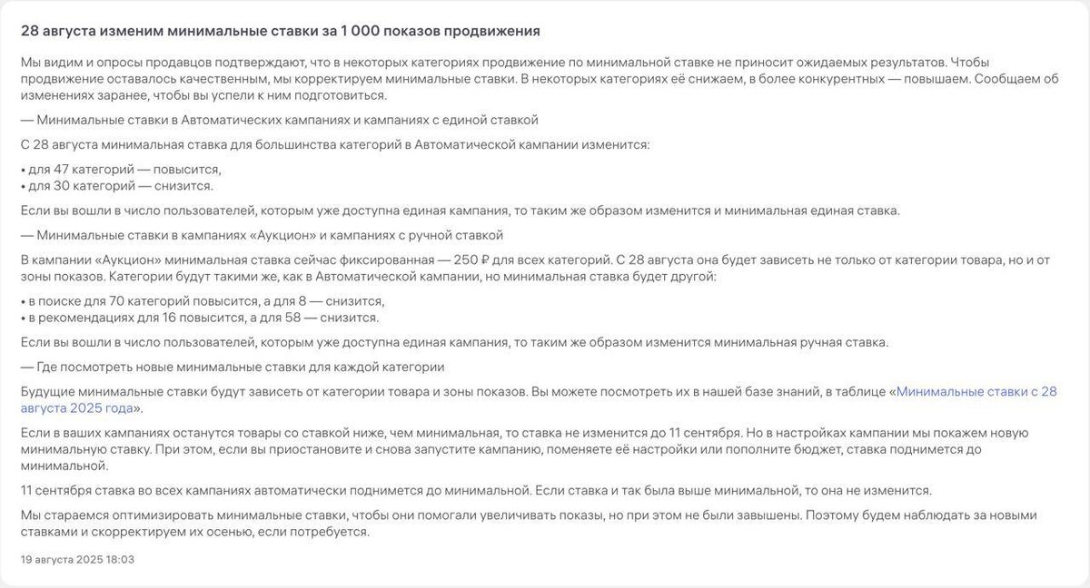 С 28 августа ВБ изменяет минимальные ставки в РК