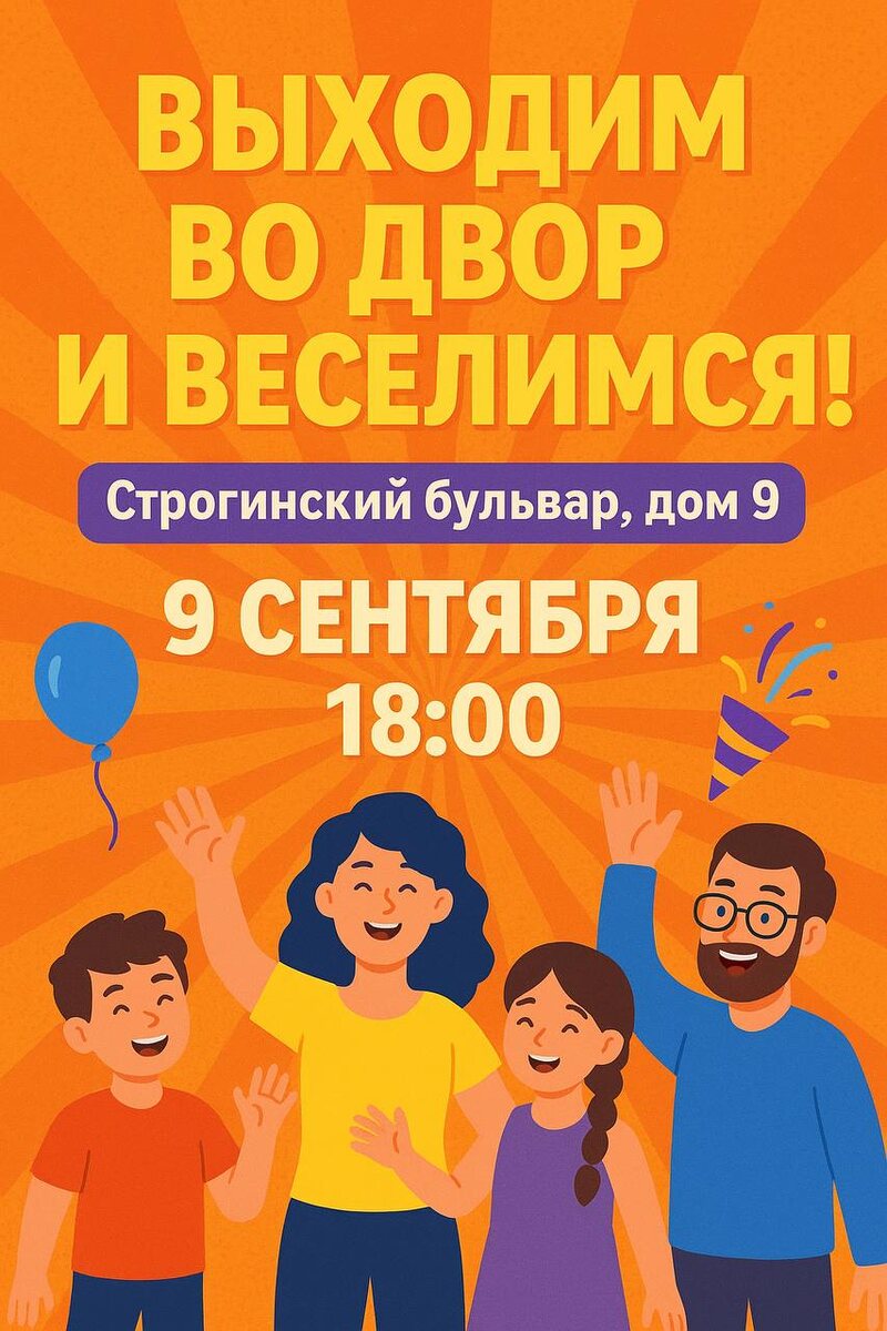 🎉 Выходим во двор и веселимся! 📍 Строгинский бульвар, дом 9 📆 9 сентября, 18:00 ☀️ Погода отличная — самое время встретиться с соседями и провести вечер в дружной компании! ✨ В программе: — Весёлые и азартные игры для детей и взрослых — Традиционное перетягивание каната 💪 — проверим силу и сплочённость команд 👨👩👧👦 Приходите всей семьёй, зовите друзей и соседей — будет шумно, весело и позитивно! 🌟 Вход свободный, хорошее настроение гарантировано! #ГБУкрылья #Строгино #выходиводвор #летовсзао