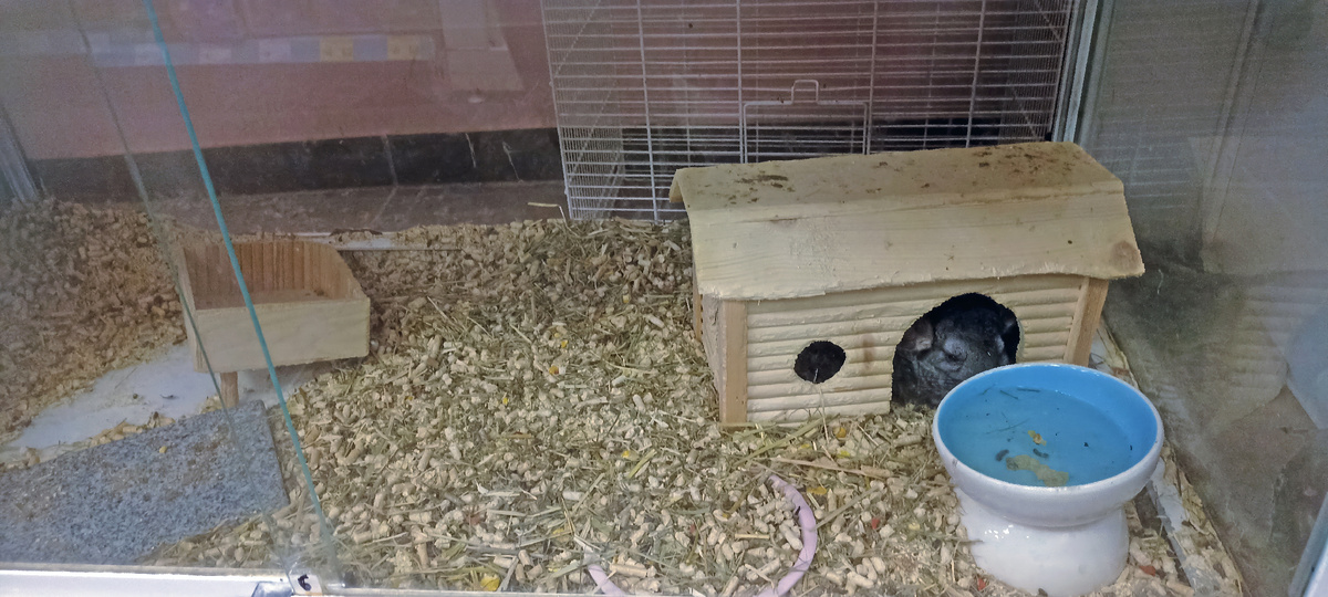 Вот пример содержания шиншиллы в одном из зоомагазинов, фото сделано 3 сентября 2025 года. По моей оценке, уборка у шиншиллы не проводилась как минимум 4 дня, но ,скорее всего, дольше. Поскольку у шиншиллы не установлен туалетный лоток, то вся площадь пола используется ей как туалет, следовательно, необходима регулярная уборка загрязненного гигиенического наполнителя. Весь пол места содержания покрыт слоем загрязненного наполнителя, количество загрязнений от одного животного свидетельствует о многодневном отсутствии уборки. Фактически отсутствует кормушка: виден верхний край керамической миски, закопанной в слой загрязненного наполнителя. Загрязненный наполнитель равномерно смешан с кормом, что говорит о том, что шиншилла вынуждена питаться в антисанитарных условиях. Вода в миске загрязнена калом и размокшим гигиеническим наполнителем - у шиншиллы отсутствует чистая питьевая вода. Отсутствует кормовое сено, необходимое для обеспечения видовых потребностей в питании. Наблюдаемые в загрязненном наполнителе фрагменты сена являются отходами, непригодными для питания, а также находятся в антисанитарной среде.