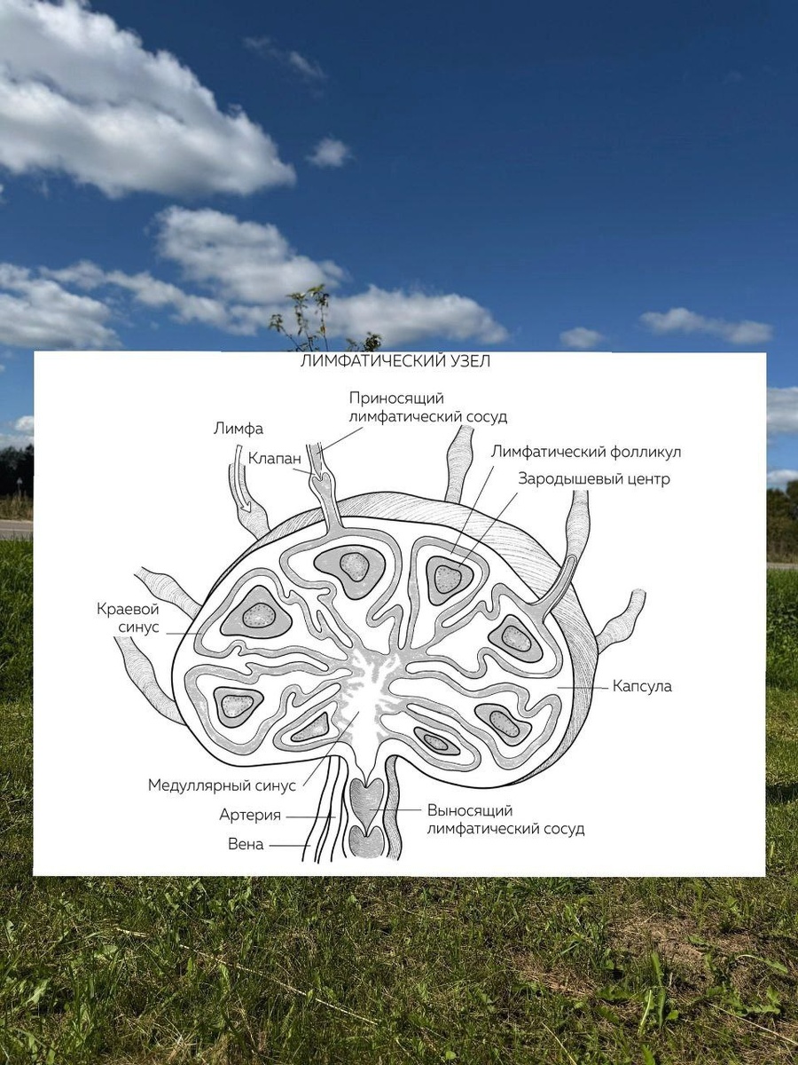 На картинке лимфоузел - именно сюда приходит загрязненная жидкость, здесь проходит очистка и уже очищенная после прохождения нескольких таких узлов жидкость идет в кровь. Если узлы не справляются с очищением - они набухают, воспаляются. Основные узлы расположены в области головы, шеи, подмышек, грудины, паха, локтя и под коленями.