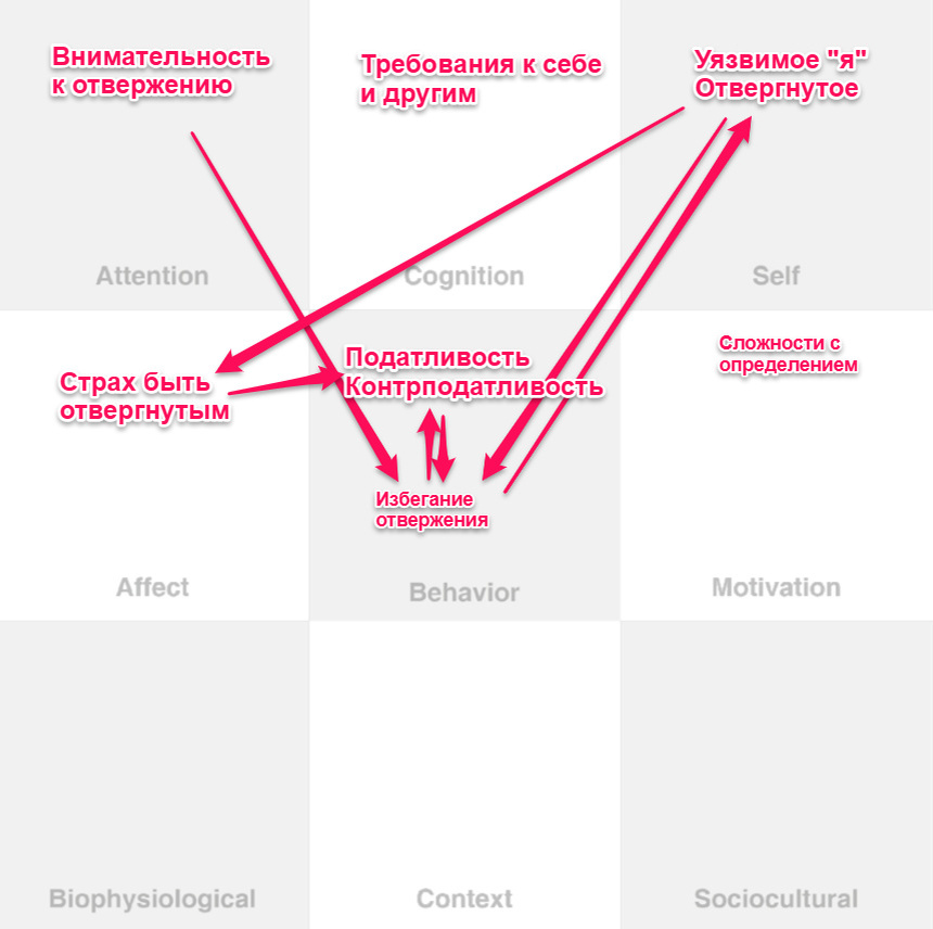 Всем привет! Сегодня хочу поговорить о том, как современная психология видит сложные внутренние процессы - не как набор отдельных черт, а как живую, динамичную сеть, где все элементы влияют друг на друга. Мой текущий интерес - построение именно таких сетевых моделей для конкретных проблем. Это удивительный инструмент, который позволяет наглядно увидеть, как формируется и поддерживается проблема. Мы можем найти порочные круги, в которых один процесс усиливает другой, и, что самое главное, - определить "ядра": те процессы, воздействуя на которые, мы можем получить максимальный эффект для решения всей проблемы в целом. Давайте разберем на примере вот этой схемы, которая иллюстрирует модель чувствительности к отвержению: Что мы здесь видим? Это не просто список качеств, а система с четкими связями. Ядро проблемы ("Уязвимое Я"): в центре всего - ощущение себя уязвимым и уже как бы "заранее отвергнутым". Это основа, на которую нанизывается все остальное. Мысли и чувства: страх быть отвергнут