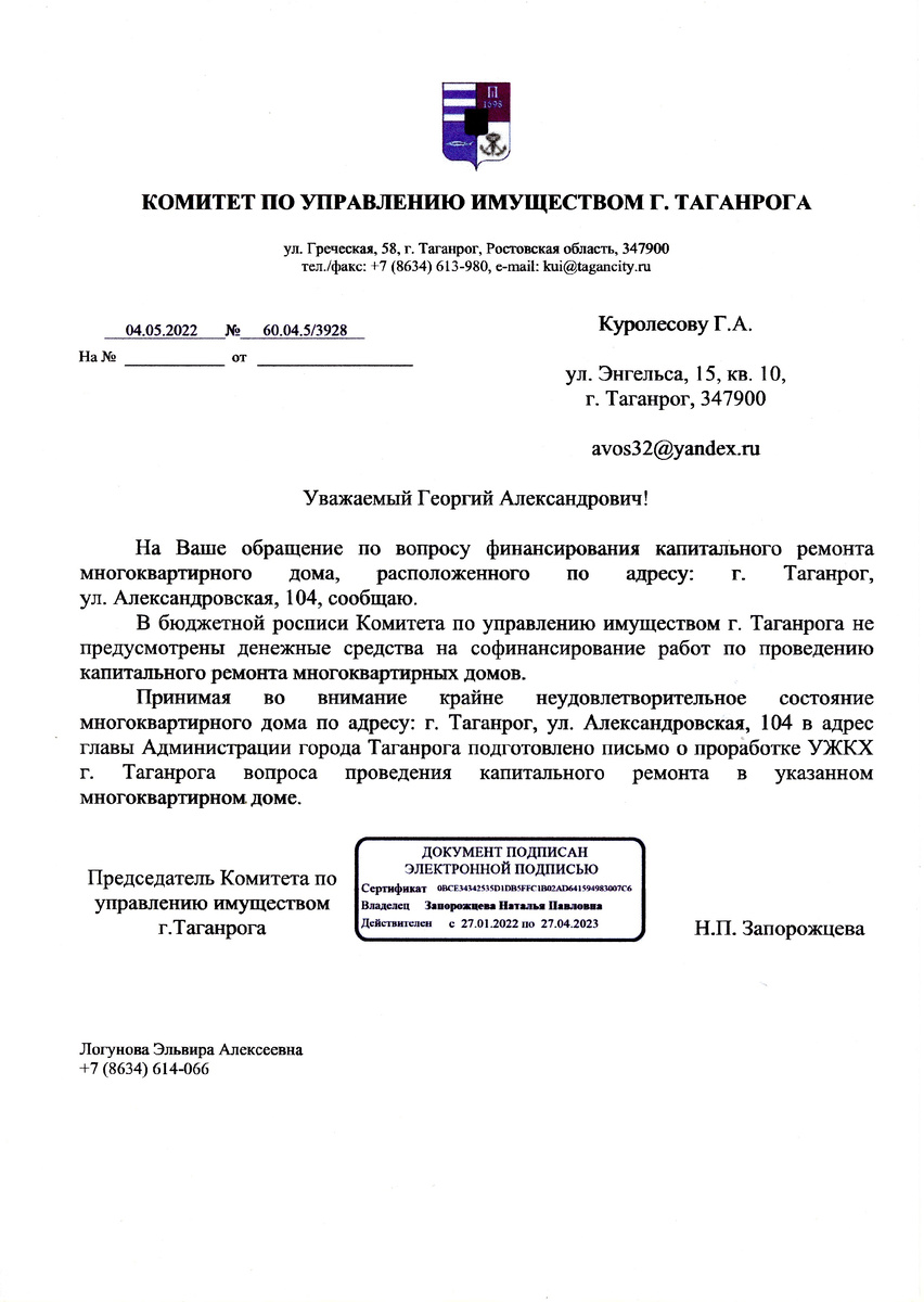 Только 04.05.2022 года Председатель КУИ Запорожцева Н.П. сообщила, что она подготовила письмо в адрес Главе Администрации о проработке УЖКХ вопроса! Что такое ВОПРОС и его ПРОРАБОТКА, а также, было ли оправлено названное письмо в указанный адрес, узнать нам, так и не удалось? Мы с Настей, не ставя вопроса и не прорабатывая его, написали и отправили электронное письмо на электронный адрес Председателя КУИ, по вопросу улучшения своих жизненных и жилищных условий в соответствии со строительными и санитарными нормами и эпидемиологическими требованиями. Поскольку 22.09.2021 года КУИ отказался выделить нам часть помещений цокольного этажа (протокол собрания №2 Эпизод 7) для обустройства в них кухонь и санузлов, мы обратились в КУИ с просьбой, дать согласие на возведение пристройки к дому. Для размещения в ней 2-кухонь, 2-х санузлов и 2-х прихожих, а также на установку во дворе дома водоразборной колонке, взяв все расходы на себя. 01.06.2022 года мы получили согласие.
