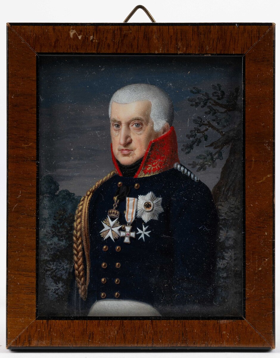 В прошлом году на одном американском аукционе был продан миниатюрный портрет «военного генерала графа Клувена» Описание лоту аукционные эксперты дали следующее: «Континентальная школа (XIX век). Миниатюрный портрет военного генерала графа Клувена, масло на кости. Изображает мужчину с короткими седыми волосами в полном военном облачении на сером фоне. Записка на обороте указывает на дату (примерно 1822 год) и имя модели». Личность неизвестного мне графа Клувена (особенно учитывая изображенные на портрете регалии, но об этом ниже) меня крайне заинтересовала. Однако никакой информации о графском роде с подобной фамилией в интернете найти не удалось. Подозреваю, что его никогда и не существовало. Правда, обнаружился какой-то итальянский роман 1952 г. под названием «Раздвоенный виконт», опубликованный в 1962 г. в английском переводе под названием, соответственно, The Cloven Viscount. The Cloven Viscount несколько похоже на Count Clouven) Но понятно, что это не то. Обсуждаемый портрет относ