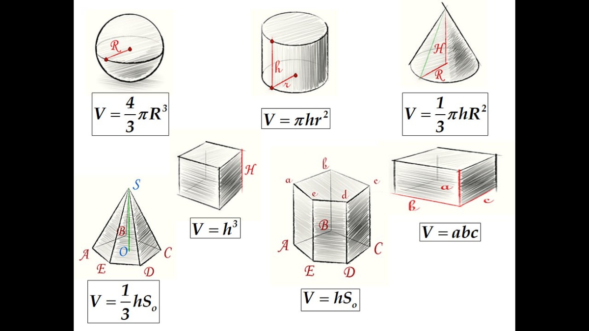 V = 1/3 * Socн * h ,где Sосн - площадь основания фигуры, h - высота фигуры.
