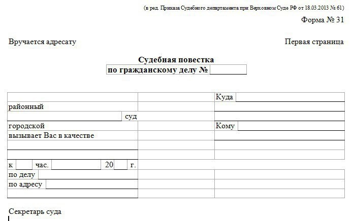 (Судебная повестка по гражданскому делу). пример закрепила под текстом