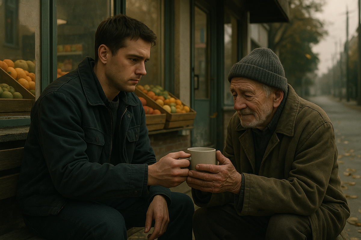 Холодным осенним утром Илья заметил, что старик особенно сгорбился, укутываясь в поношенное пальто. Его лицо казалось усталым и одиноким, но в глазах оставалась та же глубокая тишина. Что-то кольнуло Илью. Когда он открыл магазин, то, разлив себе в термосе горячего чая, вышел наружу и протянул кружку старику.