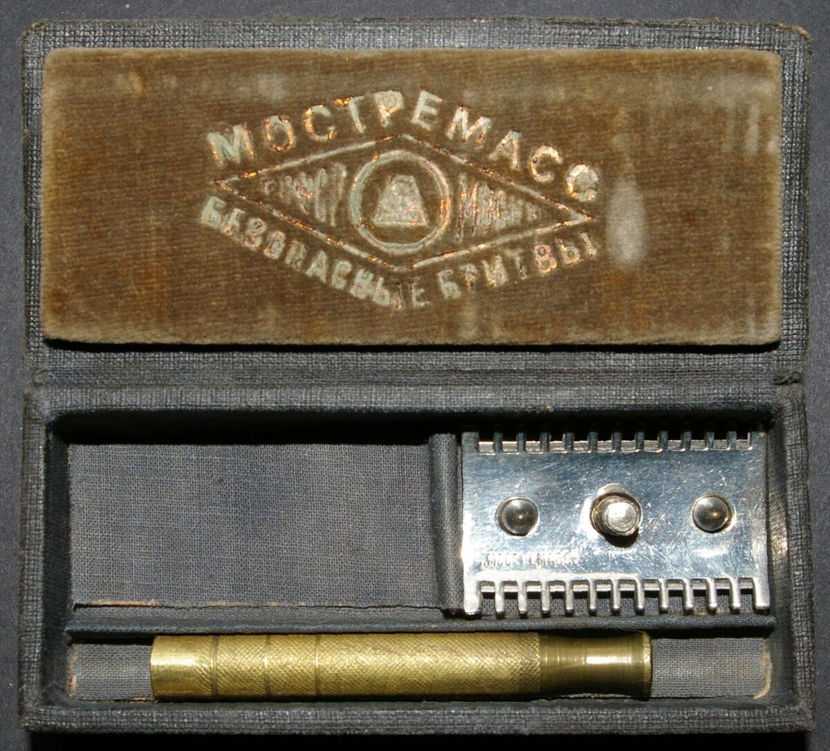 Бритвенный прибор 12-й фабрики бритв треста «Мостремасс» Мособлсовнархоза с отделкой футляра бархатом цвета хаки, комплектация “Pocket Edition”. Футляры этой конструкции с отделкой бархатом встречаются довольно редко, в коллекции есть только два подобных прибора, футляры обоих отделаны чёрным бархатом, они различаются только количеством зубцов на гребёнках станков, 14 и 13. Основная масса подобных футляров отделывалась гладкой хлопчатобумажной тканью разных цветов. Что бы плавно перейти к следующему пополнению коллекции нужно совершить краткий исторический экскурс на тему "Подпольщики – гении Управления Народным Хозяйством". Итак, события по порядку. 1. В начале 1930 года, а именно 5 января, имущество "хозяйчиков" Френкеля и Плеца, так тогда называли предпринимателей в газетах, перешло государству. Фабрика Русско-Германского товарищества досталась Московскому государственному тресту галантерейной промышленности Моссовнархоза, по-простому, "Галантерейщику". 2. Не прошло и двух недель,