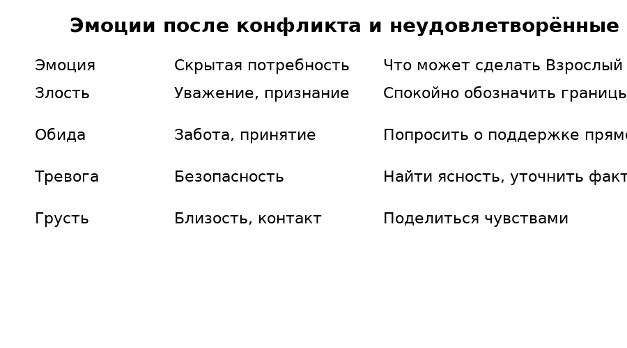 Как восстанавливаться после конфликта: быстрые техники и работа с потребностями Конфликты — часть нашей жизни. Они случаются в семье, на работе, в транспорте. После них часто остаётся «осадок»: злость, обида или тревога. Важно не только снизить эмоциональное напряжение, но и понять, что именно стоит за этим переживанием. Сегодня расскажу о двух уровнях восстановления: быстрых техниках и глубинной работе с потребностями. Уровень 1. Быстрые техники для восстановления Когда эмоции захлёстывают, важно быстро «снять накал». Помогут короткие приёмы, которые занимают всего пару минут. 1. Эмоциональный сканер Сделайте минутный «скан» тела и эмоций: * где в теле напряжение? * какая эмоция сильнее всего? * назовите её простыми словами: «я злюсь», «мне тревожно». Само называние снижает интенсивность переживаний. 2. Ритуал 60 секунд Сделайте маленький ритуал перехода: например, налейте стакан воды и медленно выпейте, представляя, как напряжение уходит с каждым глотком. Это даёт сигнал психике: «ко