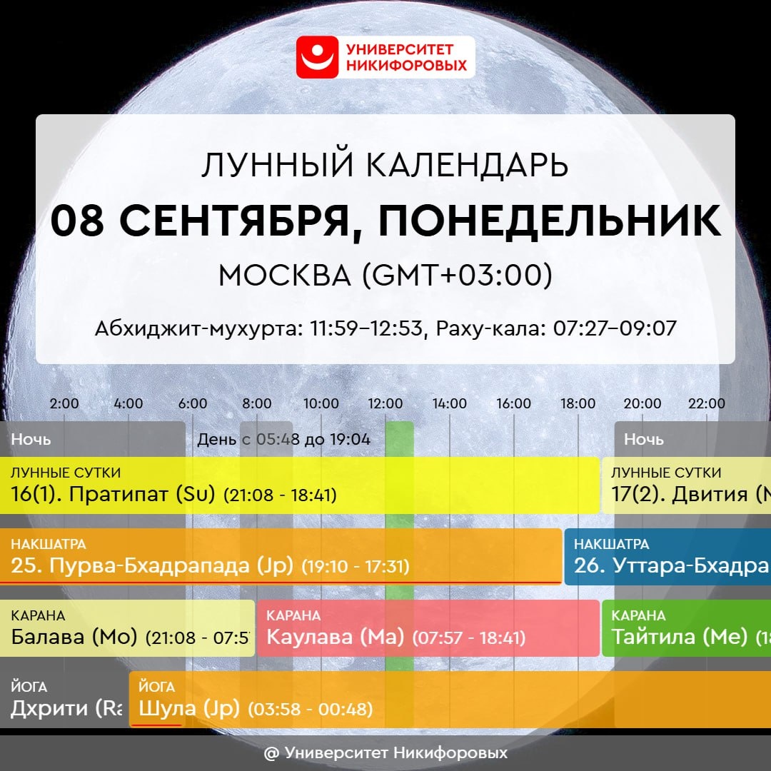 8 СЕНТЯБРЯ, ПОНЕДЕЛЬНИК После затмения пространство постепенно восстанавливается, и вместе с ним восстанавливаемся мы. Энергетика этого дня резкая и категоричная, поэтому используйте её там, где нужно отстоять себя или защитить близких. Однако будьте осторожны и не переходите границ, хотя это может оказаться непросто. Можно увидеть или узнать что-то не очень приятное о важных для вас людях или даже о самих себе. Стоит помнить, что никто из нас не идеален, в каждом из нас есть темная сторона и белая сторона. Важно, какую из этих сторон мы кормим и насколько готовы принять масштабы темной стороны другого. Находите сегодня возможность останавливаться на несколько минут, концентрируясь на каком-то предмете, наблюдать пару минут за ним и своим дыханием. Эти простейшие медитации станут хорошей опорой для вас в этот день. Сегодня начинается Питру Пакша, особенный период почитания предков в ведической традиции. Это момент, когда сокращается расстояние между нашим миром и миром предков – мо