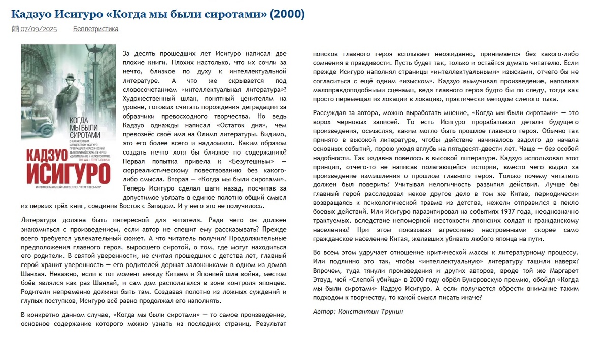 Кадзуо Исигуро «Когда мы были сиротами» Критика