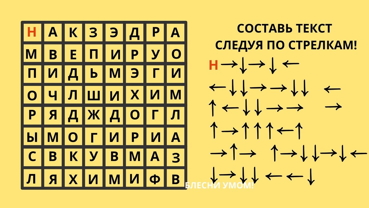 Следуй по стрелкам. Вверх, вниз, вбок. Под каждой стрелкой - буква. Буквы образуют слова, а слова - текст.